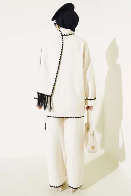 - The product is for autumn and winter. The product consists of two pieces, tunic and trousers. The tunic has a command collar and has a slit. The trousers have a straight cut with elastic waist.